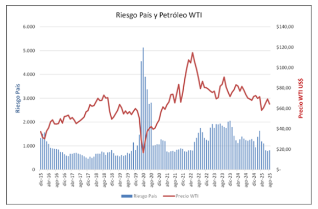 El riesgo país Ecuador mantiene su tendencia a la baja, cerrando julio en 787 puntos, así el YTD 2025 presenta mejora de 34%, mientras que el precio WTI muestra tendencia a la baja en 2025, con ligera recuperación desde abril 2025.