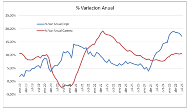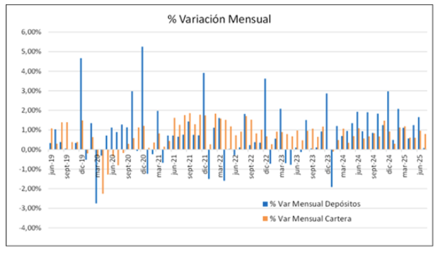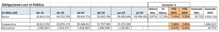 Los depósitos crecieron US$ 40 millones en julio 2025, representa 0.07% mensual, y aumento 17% anual.