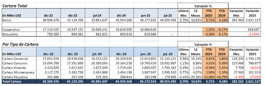Los créditos subieron US$ 382 millones en julio 2025, representa crecimiento mensual de 0.8%, y anual de 10.6%, mejor crecimiento en 2025 versus 2024.