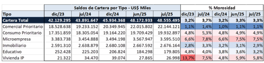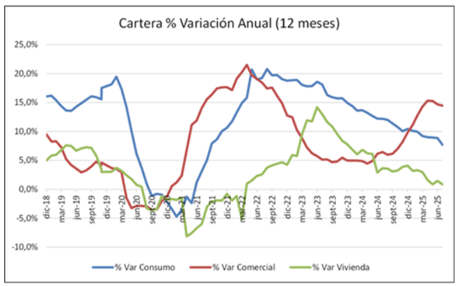 La cartera de consumo viene con desaceleración, y con tendencia a la baja por potencial deterioro de su morosidad – aun cuando el consumo de los hogares viene mejorando. Cartera Comercial presenta buena tendencia en estos últimos meses – crecimiento anual de 15%, y sube mas que en 2024. Cartera hipotecaria tuvo buen junio, y ligero crecimiento en julio.