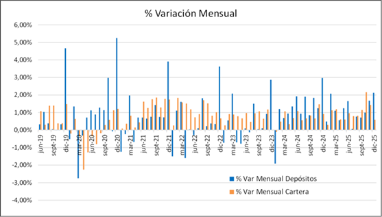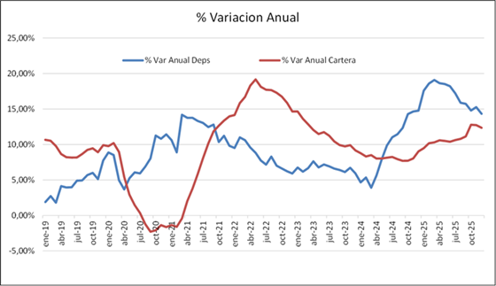 La liquidez se mantiene alta, con depósitos que crecieron 2% en diciembre, y cartera sube 0.6%.