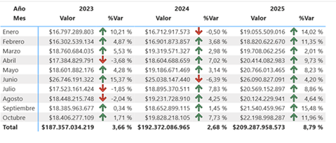 Además de la liquidez, las ventas totales y exportaciones (empresas y personas) también presentan rebote en periodo enero-octubre 2025 (ultima data disponible) con crecimiento YTD 8.8% comparado con 2.7% en mismo periodo 2024. Esta información la tenemos desagregada actividad económica y ciudad – más de 1000 actividades.