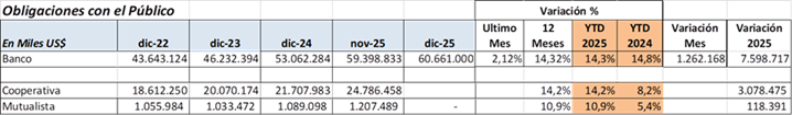 Diciembre presenta el mejor crecimiento de 2025 en depósitos, US$ 1262 millones que representa aumento de 2.1% comparado con noviembre 2025. Esta variación viene impulsada por el pago de decimo tercer sueldo en sector privado, y ventas positivas en temporada de Navidad y Fin de Año con opciones de pago desde febrero 2026.