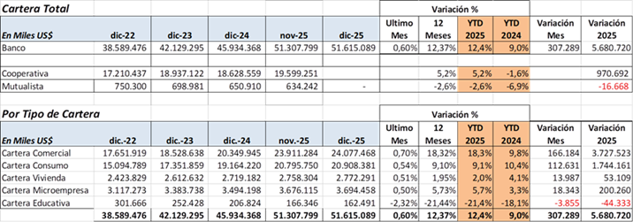 Los créditos subieron US$ 307 millones en diciembre 2025, representa aumento mensual de 0.6%, y anual de 12.4%, mejor crecimiento en 2025 versus 2024.
