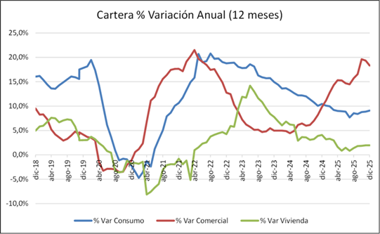 La cartera sube $307 millones en diciembre que representa 0.6% de crecimiento mensual. De estos $ 307 millones, el 54% corresponde a Cartera Comercial mientras que 37% a Consumo. Importante repunte del crédito que están tomando las empresas con crecimiento 18% anual.