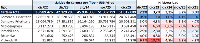 La cartera de consumo presenta ligera recuperación en II semestre, al igual que cartera hipotecaria. Cartera Comercial / Productiva presenta ligera tendencia a la baja en últimos 2 meses – crecimiento anual de 18%, mejor que en 2024.