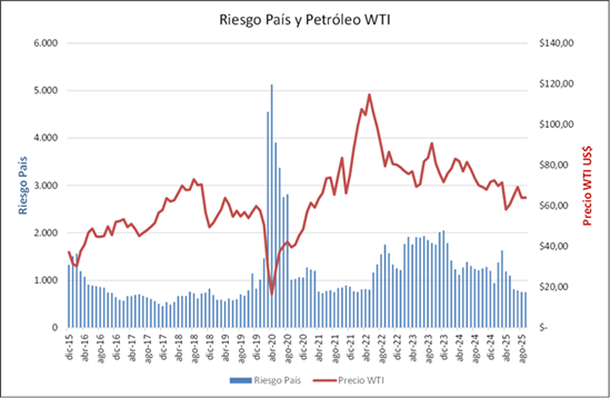 El riesgo país Ecuador mantiene su tendencia a la baja, cerrando julio en 756 puntos, y YTD 2025 presenta mejora de 38%, mientras que el precio WTI muestra tendencia a la baja en 2025, con caída de 11%.