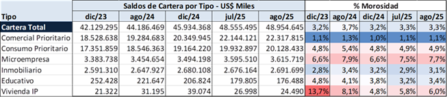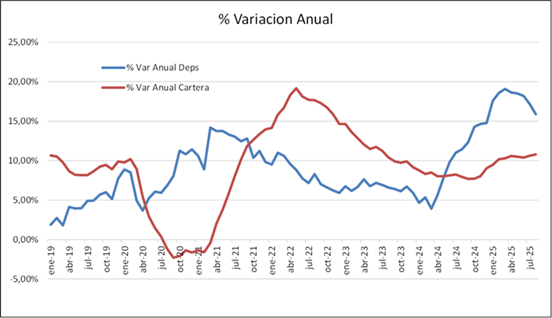 La liquidez se mantiene en alza, con recuperación de depósitos que crecieron 0.8% en agosto, al igual que la cartera, siendo cartera Productiva / Comercial la de mejor desempeño con 10% en 2025.
