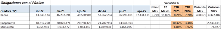 Los depósitos crecieron US$ 438 millones en agosto 2025, representa 0.77% mensual, y aumento 15.9% anual.