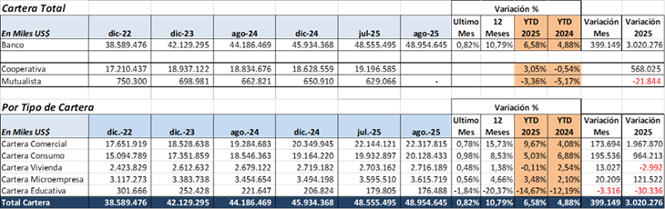 Los créditos subieron US$ 400 millones en agosto 2025, representa crecimiento mensual de 0.8%, y anual de 10.8%, mejor crecimiento en 2025 versus 2024.