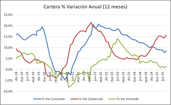 Es importante destacar que mientras la cartera de Consumo crece menos en 2025 que en 2024 (sobreendeudamiento de los hogares y tarjetas de crédito), la Comercial por el contrario crece más del doble en 2025.