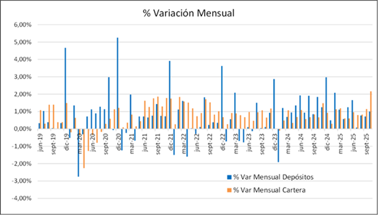 La cartera presenta el mejor mes de crecimiento en 2025, sube $1,070 millones en octubre que representa 2.2% de crecimiento mensual.
